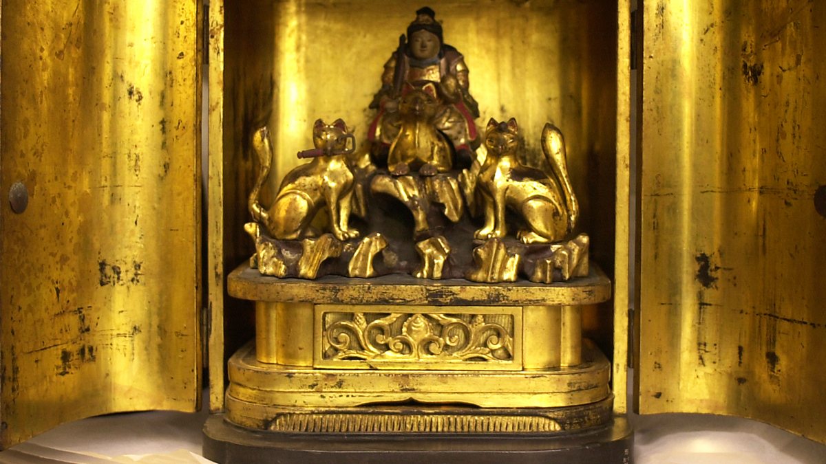 In the British Museum, a small 19th century Japanese shrine shows the spirits coming to visit a long-settled agricultural society. The curved doors of a small wooden box open to reveal, inside, a shimmering world of carved gilded wood, and a scene to which Japanese viewers would bring different interpretations.