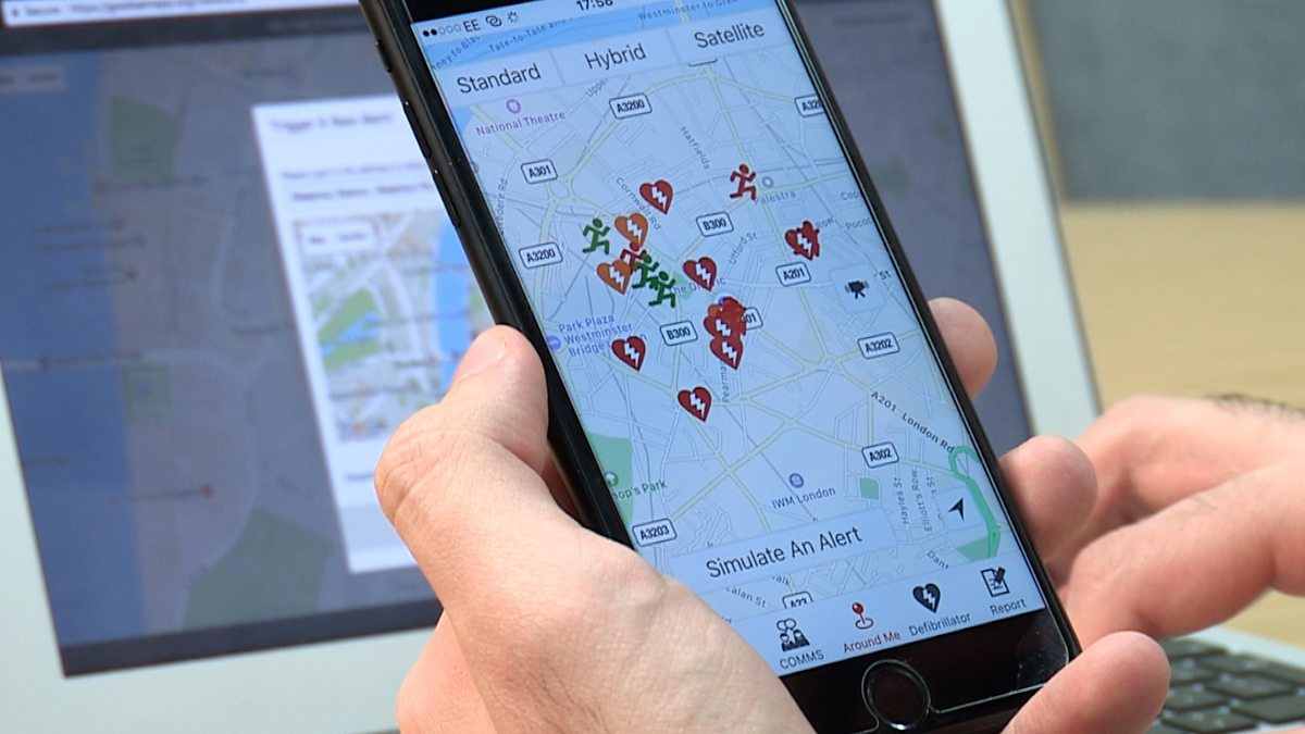 Image: The app that shows people with first aid training the location of a cardiac arrest / Credit: BBC