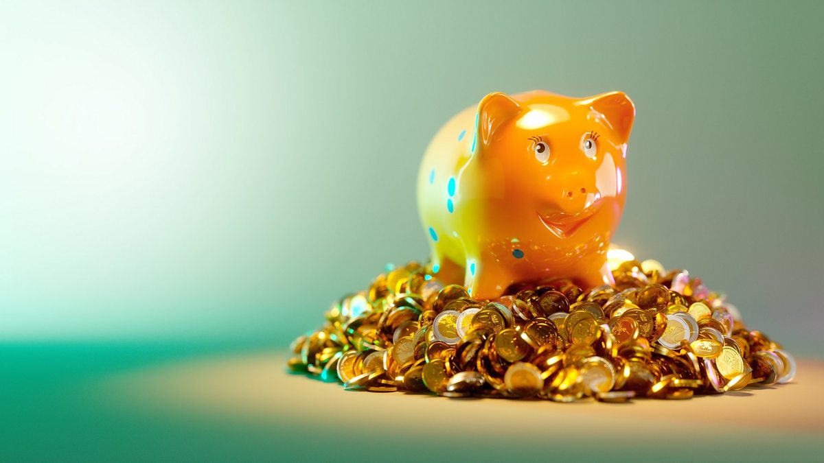 (Picture: A cute piggy bank sits astride a large pile of coins; Credit: Petmal/Getty Images)