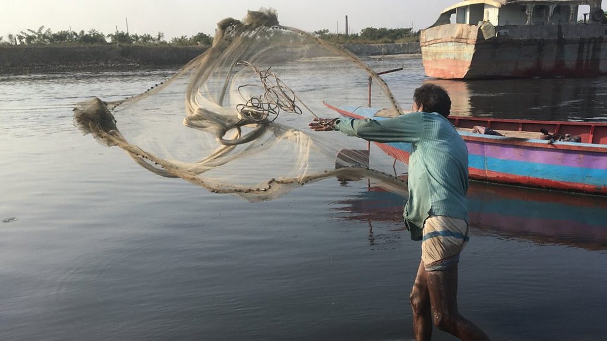 (Photo: Fisherman throwing his net into the Buriganga River, Credit: BBC)