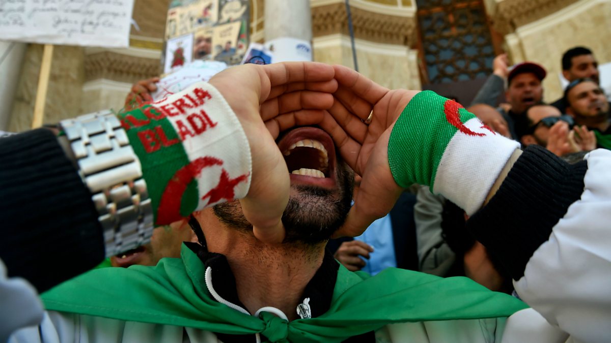 (Photo: An Algerian protester shouts slogans during a demonstration in Algiers on 1 May. Credit: Getty Images)