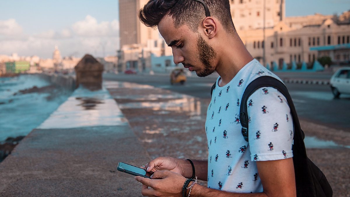 Photo: A young Cuban standing by the waterfront in Havana accesses the internet on his phone.