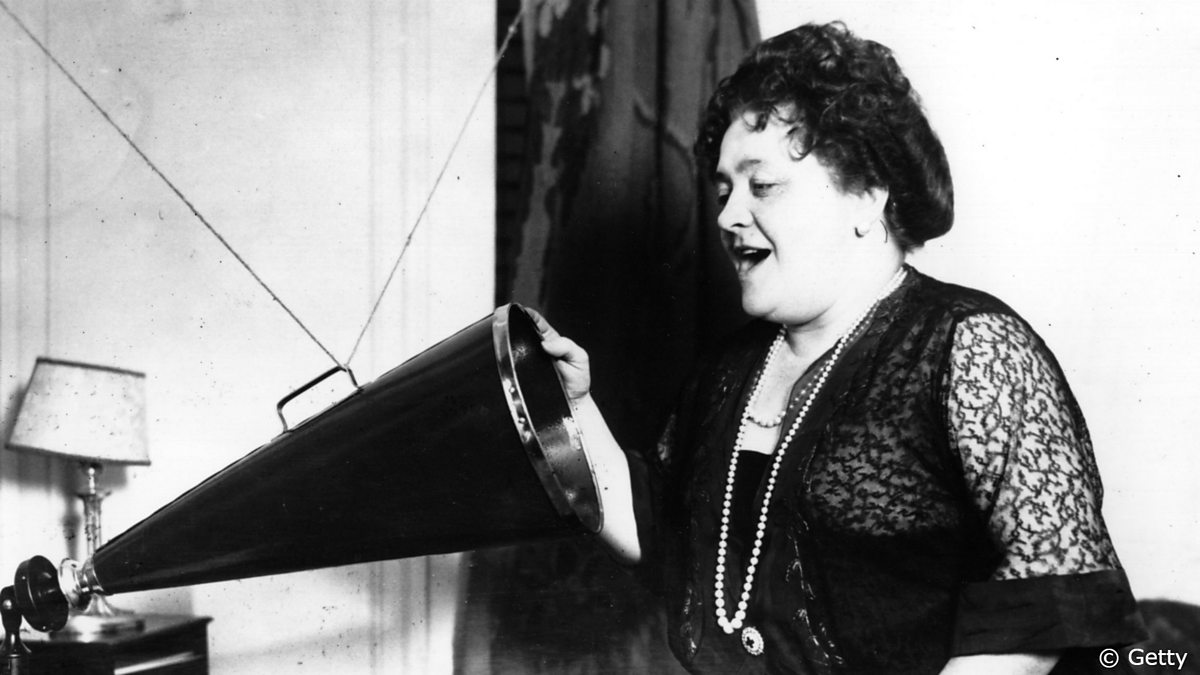 (Photo: A woman sings in front of an acoustic recording horn Credit: Getty Images)