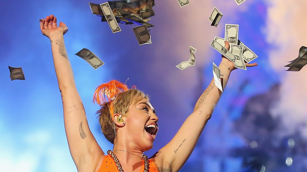 (Picture: dollar bills rain down on US pop star Miley Cyrus. Credit: Getty Images.)