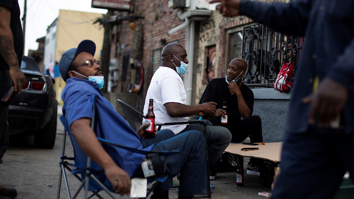 Picture caption: Men wear masks and play cards on a street in New Orleans amid the coronavirus outbreak. Credit: Reuters/Kathleen Flynn)