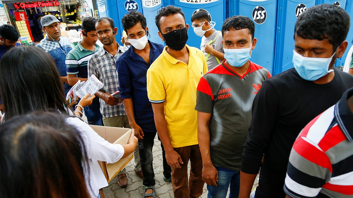 (Image: Migrant workers, mostly from Bangladesh, queue to collect free masks and get their temperatures taken in Singapore. Credit: Reuters/Feline Lim)