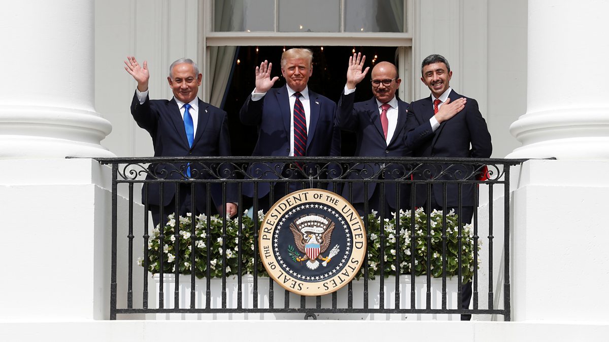 (Image: Benjamin Netanyahu, Donald Trump, Abdullatif Al Zayani and Abdullah bin Zayed wave from the White House balcony after a signing ceremony for the Abraham Accords, 15 September 2020. Credit: Reuters Reuters/Tom Brenner)