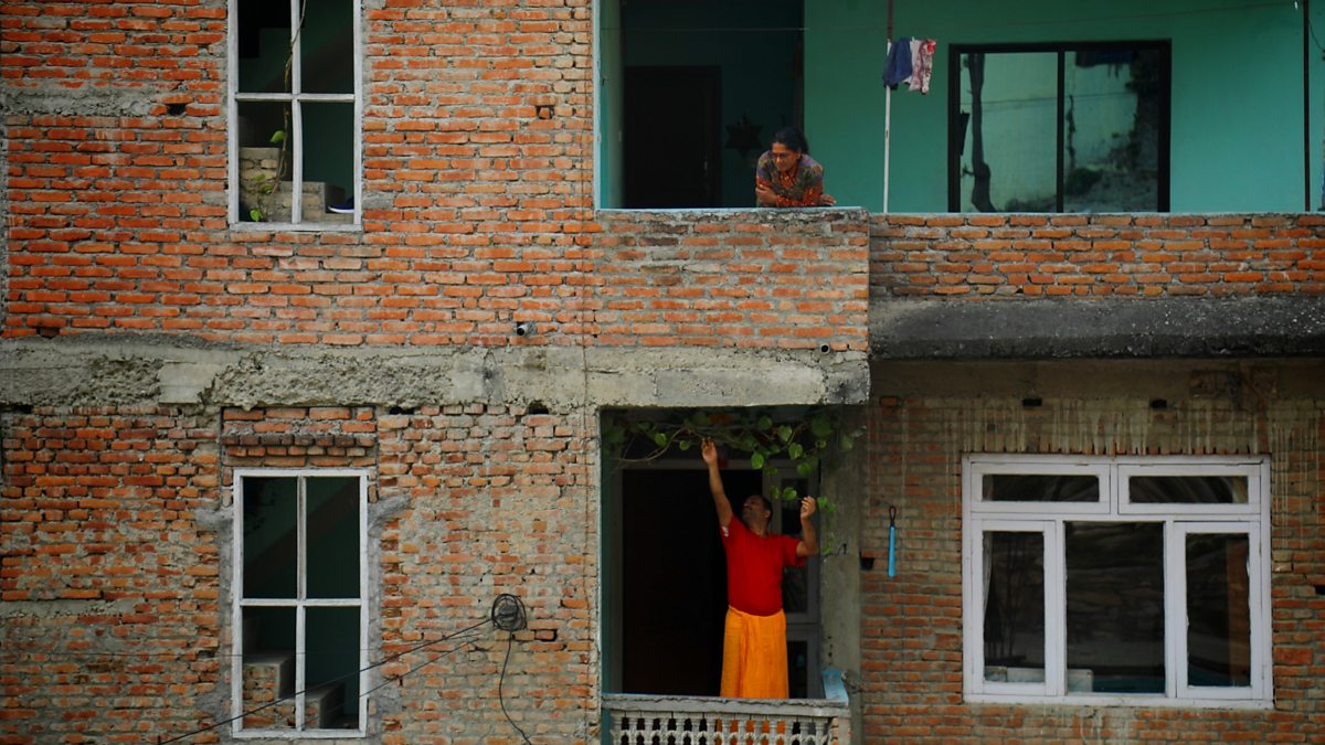 A Nepalese woman looks outside from the balcony at a residential compound during the twentieth day of lockdown in Kathmandu, Nepal by Saroj Baizu/NurPhoto via Getty Images