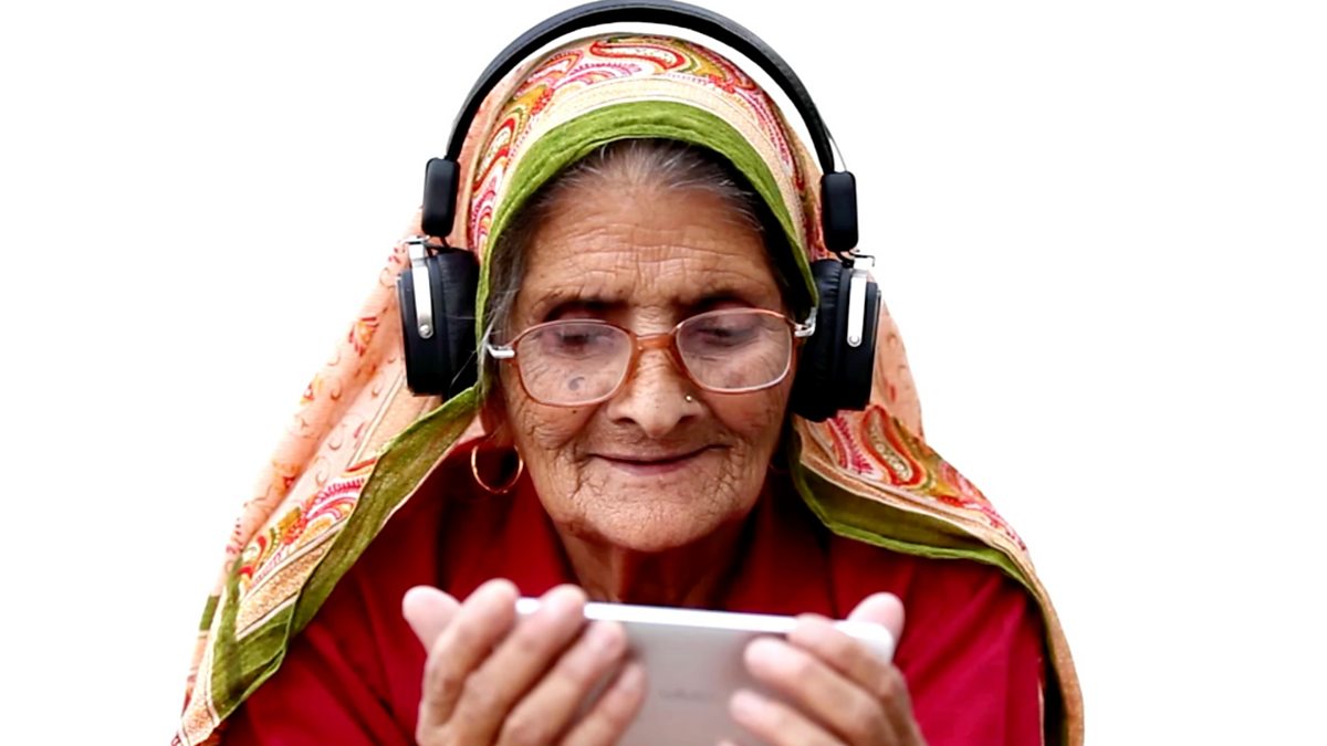 Image: Elderly Indian lady listening on headphones looking at smartphone