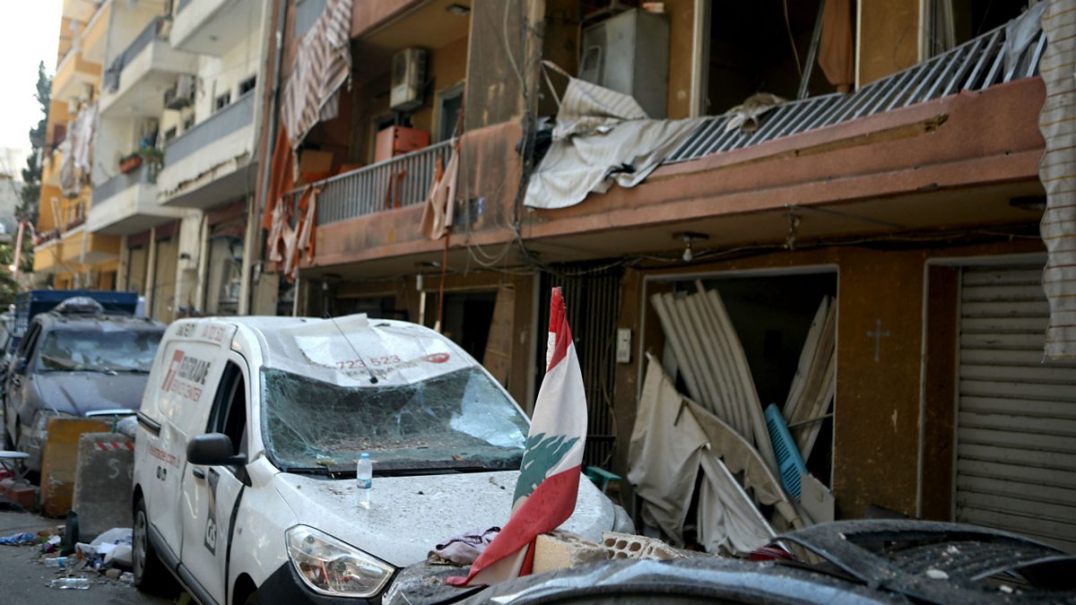 Picture: The Lebanese flag sits on the rubble in Beirut, in the aftermath of a massive explosion in the city. (PATRICK BAZ/AFP via Getty Images)