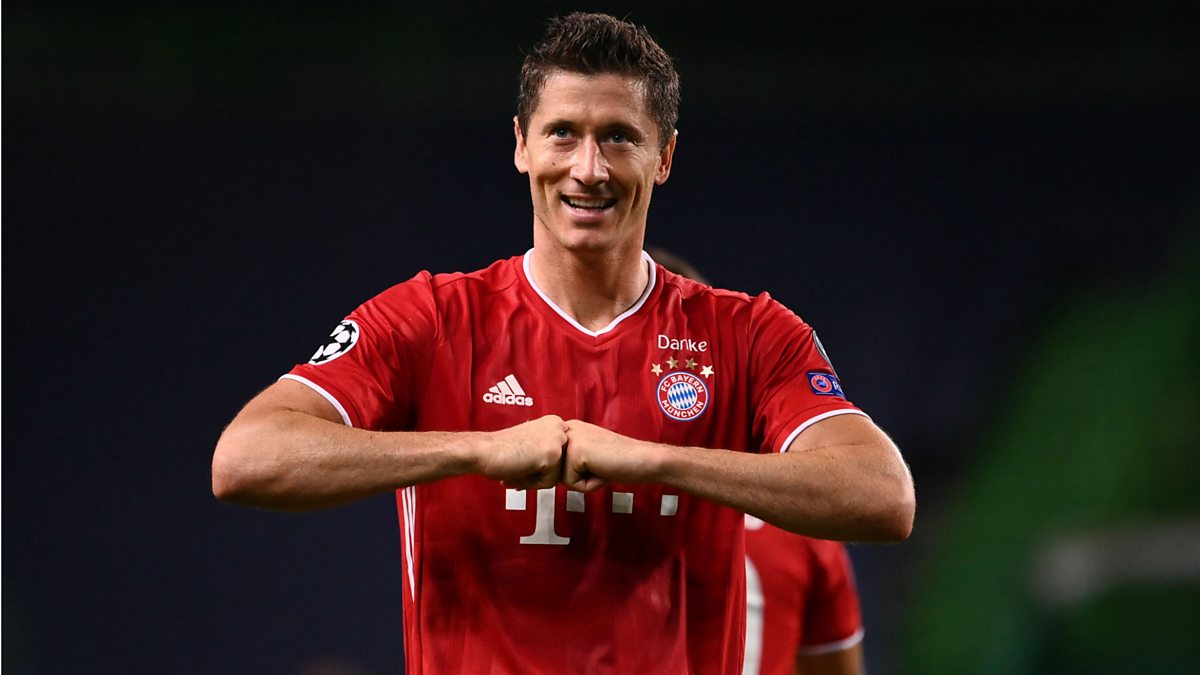 Picture: Robert Lewandowski of Bayern Munich celebrates after scoring his team's third goal against Olympique Lyonnais (Franck Fife/Pool via Getty Images)