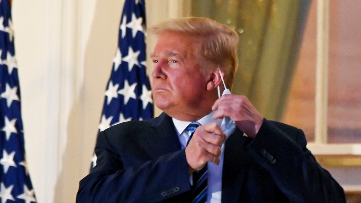 (Photo: President Donald Trump pulls off his protective face mask as he poses atop the Truman Balcony of the White House Credit: Erin Scott/File Photo/Reuters)