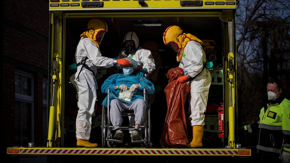(Photo: Healthcare workers from Prague Ambulance Service transport a Covid-19 patient to Semily Hospital after transfer from overloaded Ceska Lipa Hospital, Czech Republic, 18 March 2021. Credit: Martin Divisek/EPA)