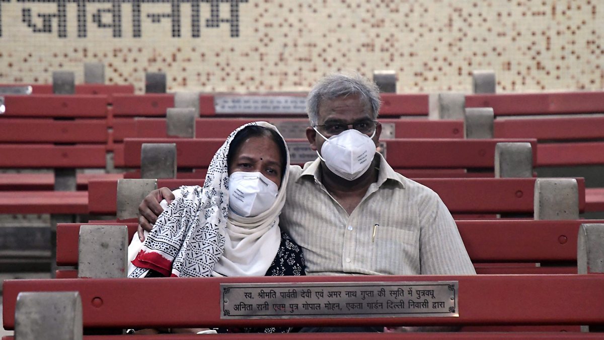(Photo: A couple mourn a relative at a crematorium in New Delhi, India. Credit: EPA)