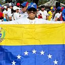 (Photo: Protesters hold up a huge Venezuelan flag. Credit: Maria Puerta-Riera)