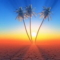 (Photo: Palm trees growing in cracked, parched earth and the sun rising behind them. Credit: Danymages/Getty Images)