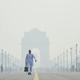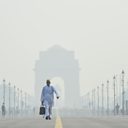 Image: A commuter walks near India Gate amid heavy smog pollution on October 29, 2025 in New Delhi, India. Delhi is once again blanketed by hazardous smog following the Diwali festival, as pollution levels spike to the "very poor" and "severe" categories, with air quality indexes far exceeding safe limits. The crisis, which is driven by firecracker use, emissions, and seasonal crop residue burning has prompted emergency measures like cloud seeding.