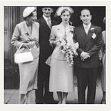 (Photo: A black and white photo of Eva Schloss on her wedding day in 1952 with her husband Zvi. Standing next to them is Eva's mother Fritzi and Otto Frank. Credit: Courtesy of Eva Schloss)
