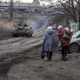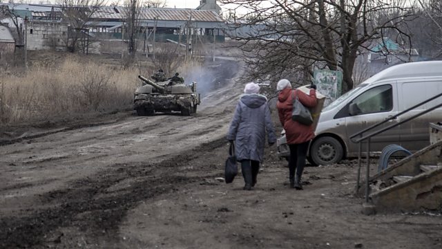 (Photo: Tank drives by civilians near Avdiivka frontline, Ukraine 20 February 2024. Credit: Narciso Contreras / Anadolu via Getty Images)