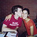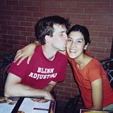 (Photo: Michael Townsend and Adriana Valdez Young in the early 2000s sitting next to each other in a restaurant, he is kissing her cheek. Credit: Michael Townsend)