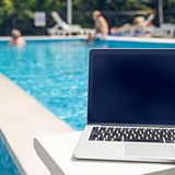 (Image: A photo of a laptop near a swimming pool on a sunny day. Credit: Getty Images)