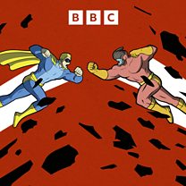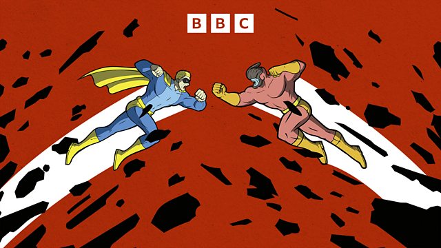 (Image: A comic book cartoon of a blond, muscle-superhero in a blue suit and yellow cape is flying through the air towards a baddie in a red suit with their fists outstretched as if ready to fight. Credit: Yogysic/Getty Images)