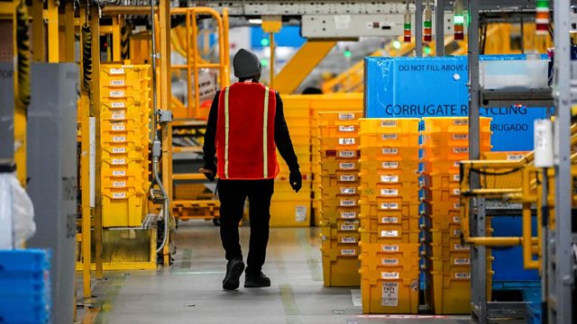 PHOTO: A worker walks next to products during Cyber Monday at the Amazon's fulfilment centre in Robbinsville, New Jersey, U.S. December 1, 2025. REUTERS/Eduardo Munoz