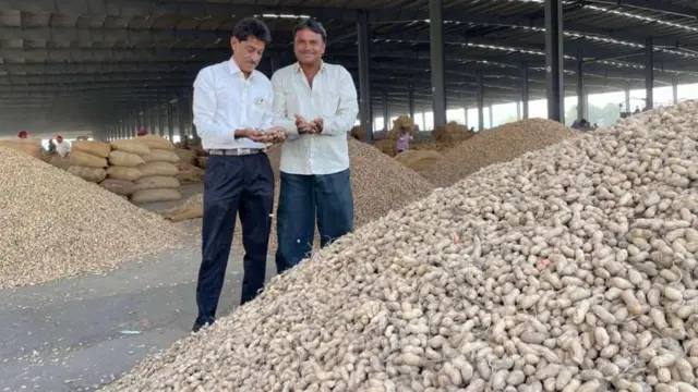 46 ਸਾਲ ਦੇ ਧੀਰਜ ਭਾਈ, ਜਿਨ੍ਹਾਂ ਕੋਲ 10 ਵਿੱਘੇ ਜ਼ਮੀਨ ਹੈ, ਉਨ੍ਹਾਂ ਨੇ ਵਿਅੰਗ ਕੱਸਦੇ ਹੋਏ ਬੀਬੀਸੀ ਨੂੰ ਦੱਸਿਆ, "ਇੱਕ ਚੰਗੇ ਸਾਲ ਵਿੱਚ, ਮੇਰੀ ਅੱਠ ਵਿੱਘੇ ਜ਼ਮੀਨ ਵਿੱਚ 300 ਮਣ ਮੂੰਗਫਲੀ ਪੈਦਾ ਹੁੰਦੀ ਹੈ ਅਤੇ ਕੀਮਤਾਂ ਬਿਹਤਰ ਹੁੰਦੀਆਂ ਹਨ। ਇਸ ਸਾਲ ਮੀਂਹ ਜ਼ਿਆਦਾ ਪੈ ਗਿਆ ਹੈ।"