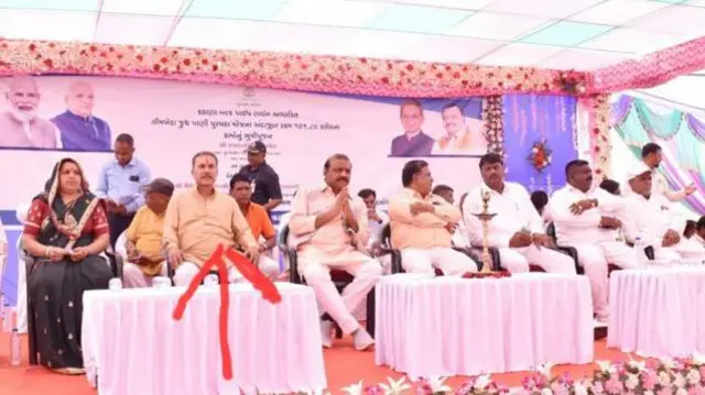 ਸਟੇਜ ਪਿੱਛੇ ਲੱਗੇ ਬੈਨਰ 'ਤੇ ਪ੍ਰਧਾਨ ਮੰਤਰੀ ਨਰਿੰਦਰ ਮੋਦੀ, ਮੁੱਖ ਮੰਤਰੀ ਭੂਪੇਂਦਰ ਪਟੇਲ, ਜਲ ਸਪਲਾਈ ਮੰਤਰੀ ਕੁੰਵਰਜੀ ਬਾਵਾਲੀਆ ਅਤੇ ਸੰਸਦ ਮੈਂਬਰ ਜਸਵੰਤਸੀਂਹ ਭਾਭੋਰ ਦੀਆਂ ਤਸਵੀਰਾਂ ਲੱਗੀਆਂ ਹੋਈਆਂ ਸਨ।