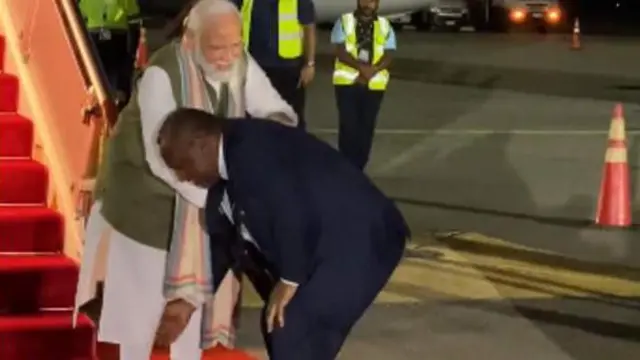 ਉਨ੍ਹਾਂ ਦੇ ਸਵਾਗਤ 'ਚ ਪਹੁੰਚੇ ਉੱਥੋਂ ਦੇ ਪ੍ਰਧਾਨ ਮੰਤਰੀ ਜੇਮਸ ਮਰਾਪੇ ਨੇ ਪ੍ਰਧਾਨ ਮੰਤਰੀ ਨਰਿੰਦਰ ਮੋਦੀ ਦੇ ਪੈਰੀਂ ਹੱਥ ਲਗਾ ਕੇ ਉਨ੍ਹਾਂ ਪ੍ਰਤੀ ਸਨਮਾਨ ਪ੍ਰਗਟਾਇਆ।