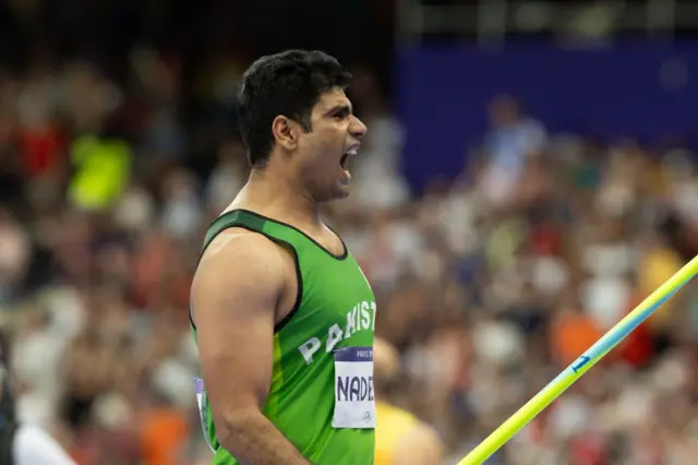 ਪਾਕਿਸਤਾਨ ਨੇ ਅਰਸ਼ਦ ਨਦੀਮ ਨੇ ਪੈਰਿਸ ਓਲੰਪਿਕ ਵਿੱਚ ਮਰਦਾਂ ਦੇ ਜੈਵਲਿਨ ਥਰੋ ਮੁਕਾਬਲੇ ਵਿੱਚ 92.97 ਮੀਟਰ ਦੀ ਦੂਰੀ ਤੱਕ ਜੈਵਲਿਨ ਸੁੱਟਕੇ ਨਵਾਂ ਓਲੰਪਿਕ ਰਿਕਾਰਡ ਬਣਾਇਆ ਅਤੇ ਸੋਨੇ ਦਾ ਮੈਡਲ ਜਿੱਤਿਆ।