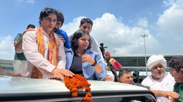 ਏਅਰਪੋਰਟ 'ਤੇ ਓਲੰਪਿਕ ਤਗਮਾ ਜੇਤੂ ਪਹਿਲਵਾਨ ਸਾਕਸ਼ੀ ਮਲਿਕ, ਪਹਿਲਵਾਨ ਬਜਰੰਗ ਪੂਨਿਆ ਅਤੇ ਕਾਂਗਰਸੀ ਸੰਸਦ ਮੈਂਬਰ ਦੀਪੇਂਦਰ ਹੁੱਡਾ ਸਣੇ ਸੈਂਕੜੇ ਲੋਕ ਵਿਨੇਸ਼ ਦੇ ਸਵਾਗਤ ਲਈ ਇਕੱਠੇ ਹੋਏ ਸਨ।