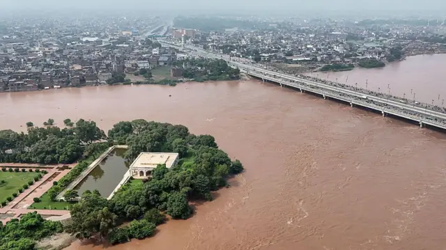 ਰਾਵੀ ਵਿੱਚ ਪਾਣੀ ਇੰਨਾ ਚੜਿਆ ਹੋਇਆ ਹੈ ਕਿ ਇਸ ਕੋਲ ਜਾਣਾ ਖ਼ਤਰੇ ਤੋਂ ਘੱਟ ਨਹੀਂ ਹੈ ਪਰ ਫਿਰ ਵੀ ਕੁਝ ਲੋਕ ਪਾਣੀ ਨਾਲ ਭਰੇ ਰਾਵੀ ਦਰਿਆ ਦੀ ਇੱਕ ਝਲਕ ਵੇਖਣ ਨੂੰ ਜਾ ਰਹੇ ਹਨ।
