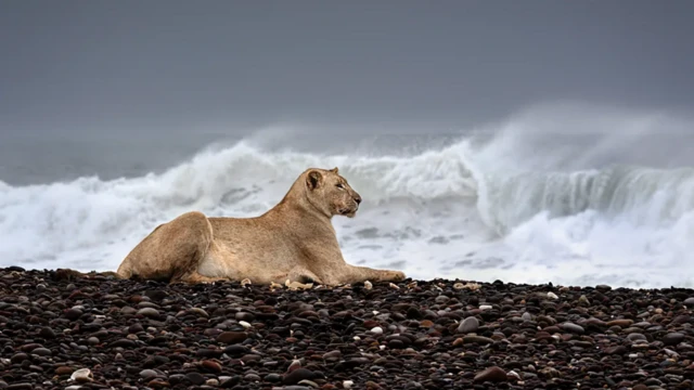 ਇਸ ਸ਼ਾਨਦਾਰ ਫੋਟੋ ਵਿੱਚ, ਇੱਕ ਮਾਦਾ ਸ਼ੇਰਨੀ ਨਾਮੀਬੀਆ ਵਿੱਚ ਇੱਕ ਪਥਰੀਲੀ ਬੀਚ 'ਤੇ ਬੈਠੀ ਹੈ ਅਤੇ ਆਪਣੇ ਪਰਲੇ ਪਾਸੇ ਕਿਨਾਰੇ ਨਾਲ ਟਕਰਾ ਰਹੀਆਂ ਲਹਿਰਾਂ ਨੂੰ ਧਿਆਨ ਨਾਲ ਦੇਖ ਰਹੀ ਹੈ।