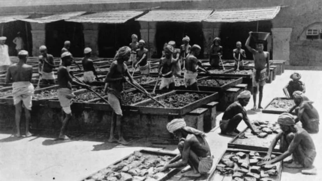 ਕਈ ਹਜ਼ਾਰ ਮਜ਼ਦੂਰਾਂ ਨੇ ਗੰਗਾ ਨਦੀ ਦੇ ਕੰਡੇ ਦੋ ਅਫ਼ੀਮ ਦੇ ਕਾਰਖਾਨਿਆਂ ਵਿੱਚ ਬੀਜ ਵਿੱਚੋਂ ਨਿਕਲੇ ਦੁੱਧ ਵਰਗੇ ਤਰਲ ਪਦਾਰਥ ਨੂੰ ਸੁਕਾਇਆ। ਇਸ ਪਦਾਰਥ ਨੂੰ ਮਿਕਸ ਕੀਤਾ, ਕੇਕ ਬਣਾਇਆ ਅਤੇ ਅਫੀਮ ਦੀਆਂ ਗੇਂਦਾਂ ਨੂੰ ਲੱਕੜ ਦੇ ਸੰਦੂਕਾਂ ਵਿੱਚ ਬੰਨਿਆ।