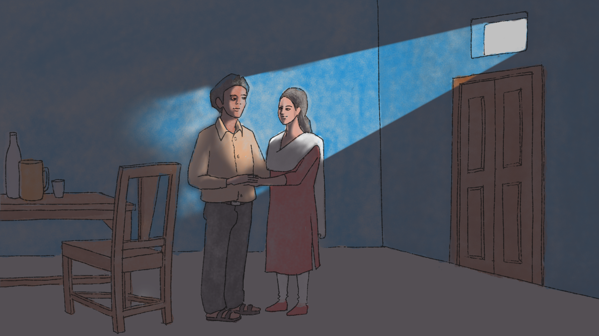 ਕੌਮੀ ਰਾਜਧਾਨੀ ਦੇ ਗੁਆਂਢ ਵਿੱਚ ਇੱਕ ਹੋਰ ਜਗ੍ਹਾ ’ਤੇ, ਇੱਕ ਭਗੌੜੇ ਜੋੜੇ ਨੇ ਇੱਕ ਸੁਰੱਖਿਅਤ ਘਰ ( ਸਰਕਾਰ ਵਲੋਂ ਅਜਿਹੇ ਜੋੜਿਆਂ ਨੂੰ ਮੁਹੱਈਆ ਕਰਵਾਏ ਜਾਂਦੀ ਰਿਹਾਇਸ਼) ਦਾ ਦਰਵਾਜ਼ਾ ਥੋੜ੍ਹਾ ਜਿਹਾ ਖੋਲ੍ਹਿਆ ਇਹ ਕਹਿਣ ਲਈ ਕਿ ਉਹ ਬਾਹਰ ਕਦਮ ਨਹੀਂ ਰੱਖ ਸਕਦੇ।
