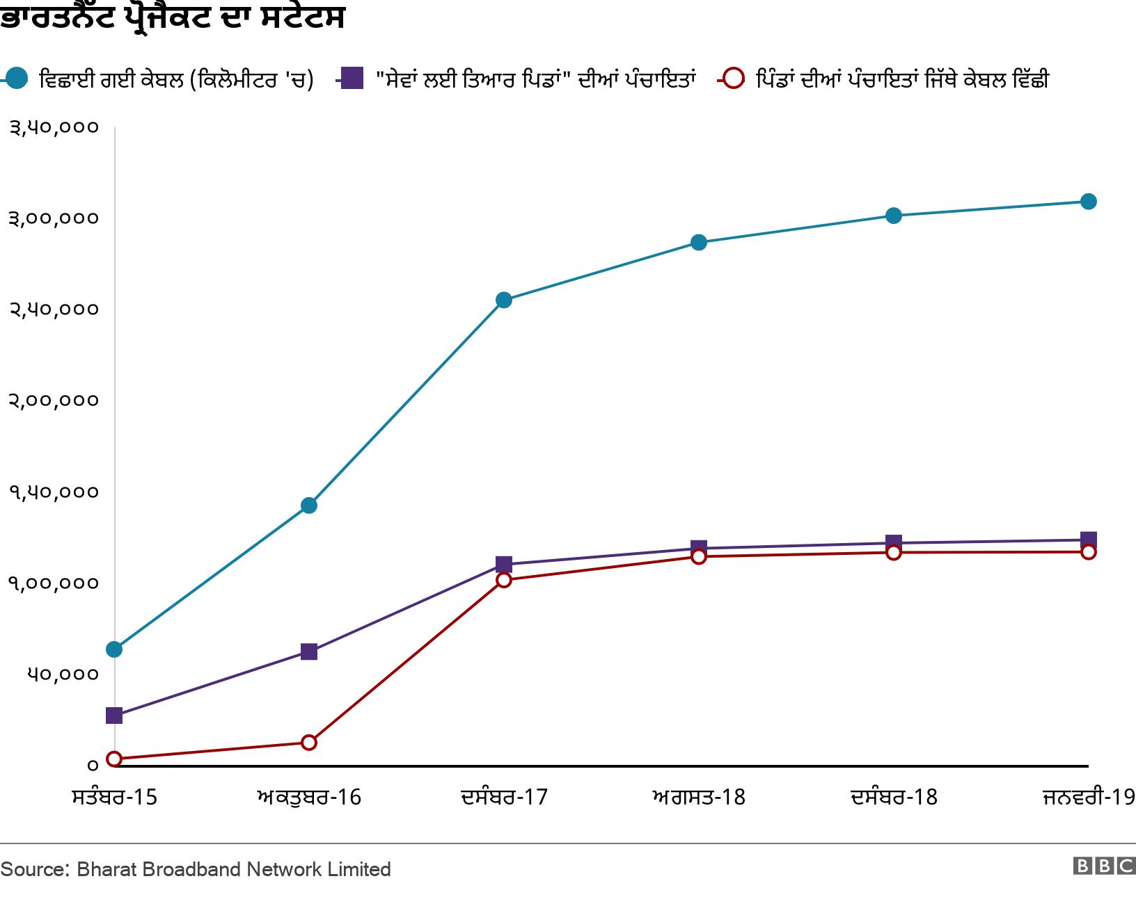 ਕੁੱਲ ਮਿਲਾ ਕੇ, ਇਸ ਸਾਲ ਜਨਵਰੀ ਦੇ ਅੰਤ ਤੱਕ ਅਧਿਕਾਰਤ ਅੰਕੜੇ ਦੱਸਦੇ ਹਨ ਕਿ 1,23,489 ਪਿੰਡਾਂ ਦੀਆਂ ਪੰਚਾਇਤਾਂ ਤੱਕ ਕੇਬਲ ਵਿਛਾਈ ਗਈ ਹੈ ਅਤੇ ਉਨ੍ਹਾਂ ਵਿਚੋਂ 1,16,876 'ਚ ਉਪਕਰਨ ਸਥਾਪਿਤ ਕੀਤੇ ਗਏ ਹਨ।