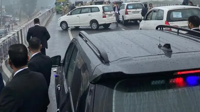 ਰਸਤੇ ਵਿੱਚ ਵੀ ਇਸੇ ਤਰ੍ਹਾਂ ਸਕਿਓਰਿਟੀ ਦਾ ਪ੍ਰਬੰਧ ਹੁੰਦਾ ਹੈ। ਕਿਸੇ ਘਟਨਾ ਦੇ ਹੋਣ 'ਤੇ ਇਹ ਤੈਅ ਹੁੰਦਾ ਹੈ ਦੋ ਸੌ ਤੋਂ ਸੌ ਮੀਟਰ ਦੂਰੀ 'ਤੇ ਪਹਿਲਾਂ ਹੀ ਕਾਫ਼ਲੇ ਨੂੰ ਰੋਕਿਆ ਜਾਵੇ ਤਾਂ ਕਿ ਕੋਈ ਪ੍ਰਧਾਨ ਮੰਤਰੀ ਤੱਕ ਪਹੁੰਚ ਨਾ ਸਕੇ।