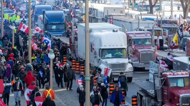 ਕੈਨੇਡਾ ਦੀ ਰਾਜਧਾਨੀ ਓਟਾਵਾ ਦੀਆਂ ਸਥਾਨਕ ਸੜਕਾਂ ਜਾਮ ਹਨ ਅਤੇ ਪ੍ਰਦਰਸ਼ਨਕਾਰੀ ਟਰੱਕਾਂ ਦੇ ਹਾਰਨ ਵਜਾ-ਵਜਾ ਕੇ ਆਪਣਾ ਵਿਰੋਧ ਦਰਜ ਕਰ ਰਹੇ ਹਨ।