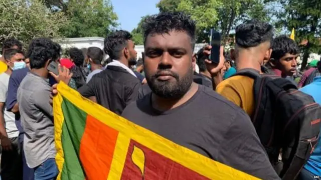 ਮੁਜ਼ਹਰਾਕਾਰੀ ਕੁਰਸੀਆਂ 'ਤੇ ਡੈਸਕ 'ਤੇ ਖੜ੍ਹੇ ਹਨ ਅਤੇ ਸ਼੍ਰੀਲੰਕਾ ਦਾ ਝੰਡਾ ਲਹਿਰਾ ਰਹੇ ਹਨ। ਉਤਸ਼ਾਹਿਤ ਮੁਜ਼ਹਰਾਕਾਰੀ ਨਾਅਰੇ ਲਗਾ ਰਹੇ ਹਨ, "ਅਸੀਂ ਪਹਿਲਾਂ ਹੀ ਕਿਹਾ ਸੀ ਕਿ ਸਾਡੇ ਨਾਲ ਪੰਗਾ ਨਾ ਲਓ।"