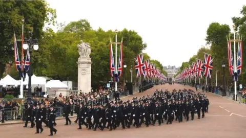 ਲੱਖਾਂ ਲੋਕੀਂ ਟੀਵੀ ਅਤੇ ਸੋਸ਼ਲ ਮੀਡੀਆ ਰਾਹੀ ਮਹਾਰਾਣੀ ਦੀ ਅੰਤਿਮ ਯਾਤਰਾ ਦੇਖ ਰਹੇ ਹਨ।