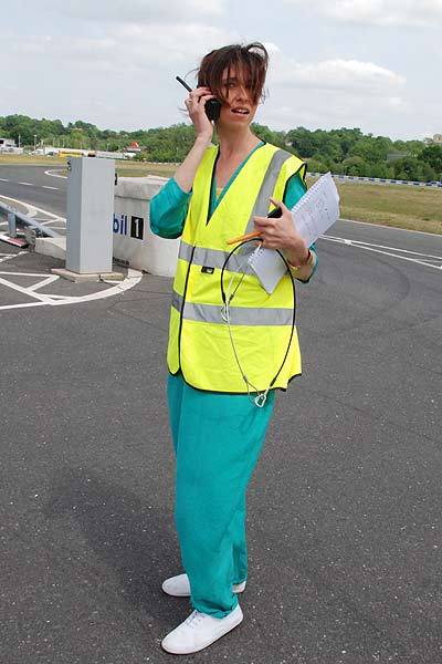 Jo-Jo, from the Sporting Challenge production team, gets to grips with her walkie-talkie (we think the Holby City outfit was unintentional).