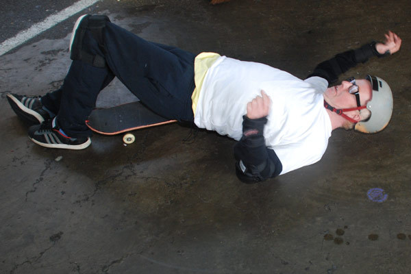 Chris demonstrates why a helmet and padding are essential wear for anyone learning to skateboard