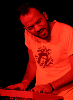 Mushtaq plays the keyboards in his collaboration with Terry Hall (© and courtesy of Philip Ryalls)