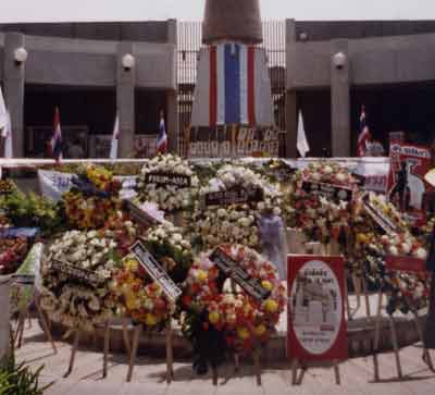 |  |  | | Memorial to the victims of 1973. | For much of King Bhumibol's reign Thailand was governed by a succession of military dictatorships. But at crucial times in the country's history, the King has stepped forward to intervene. In 1973, for example, when the police and army fired on demonstrating students, killing scores of them, the King opened the Palace gates to give the students shelter. And more recently, in 1992, when more demonstrations and violence broke out, the King ordered the two main political opponents to his palace and gave them a very public, televised, dressing down. It led to the end of their careers and a return to civilian government.