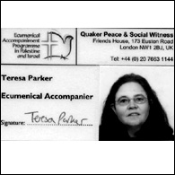 Teresa Parker, took a gap '3 months' to go to the West Bank as a human rights worker and observer. Teresa is a Quaker and through them she heard about the Ecumenical Accompaniment programme in Palestine and Israel. She gave up her job as a mental Health worker and joined the group.
