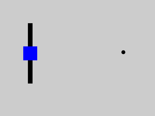 Repeat the procedure as in experiment number 1. Shut your right eye and look at the black dot on the right with your left eye. Move your head until your blindspot causes the blue square to disappear. Does thevertical line look continuous or does it have a gap in the middle? | |||