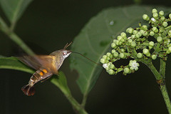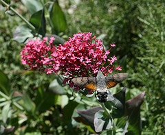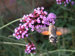 As its name suggests the adults of this species resemble hummingbirds as they fly rapidly between foodplants and hover to feed on tubular flowers of plants such as viper’s bugloss, red valerian, jasmine, petunia and the garden favourite; buddleia. The orange-brown hindwings and black and white chequered body can be seen in flight and, with its warm greyish-brown forewings, distinguish the Humming-bird Hawk-moth from the Bee Hawk-moths that exhibit similar flight characteristics. The Humming-bird Hawk-moth can be found in many habitats from coastal areas to gardens, woodland rides and townhouse window boxes.