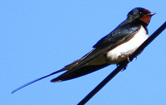 Swallows are small birds; about 7-8in in length (17-20cm), with a wing span reaching 12-14” (30-35cm). They are extremely agile and graceful in flight and spend most of their time on the wing, twisting and turning to catch airborne insects. You often see them either circling gracefully overhead, or swooping low over the water or ground, snatching up food. Like house martins and swifts, swallows feed on the wing hoovering up insects in their large gaping mouths, like flying vacuum cleaners! The long tail is put to good use whilst they briefly stall in flight, intercept an insect and move on. Although they spend much of their time on the wing, you can also see swallows perching on wires and other prominent perches