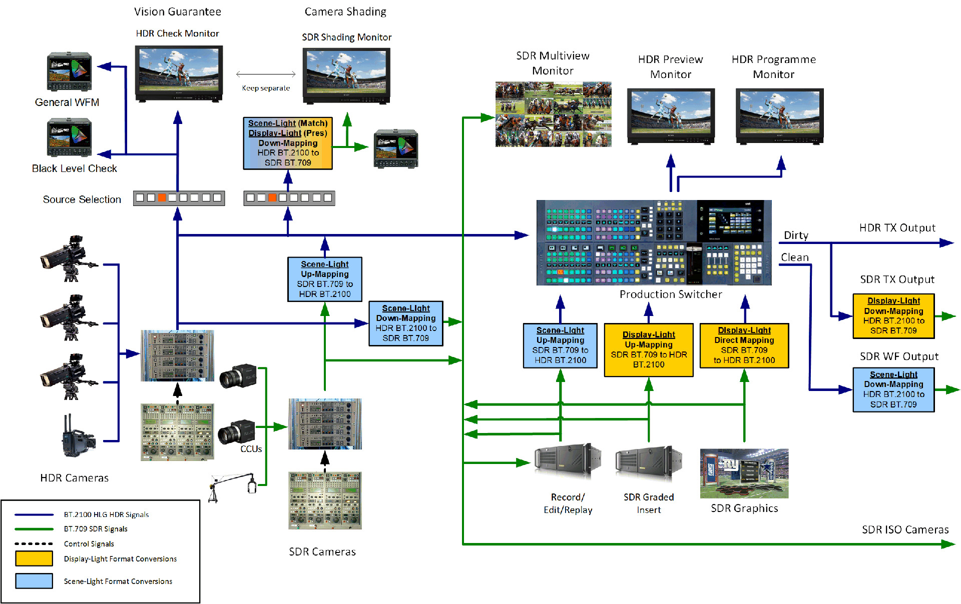 SDR cameras were always shaded via an up-mapper and down-mapper, as illustrated in the diagram. So the Vision Engineers were again viewing an identical picture to the truck's main SDR output.